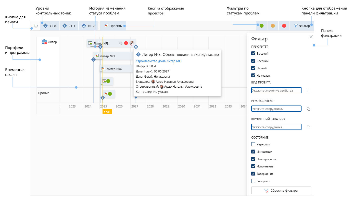 - Четкое отображение стратегических целей проекта: видно весь путь целиком, стейкхолдеры могут не погружаться в рутинные операции.