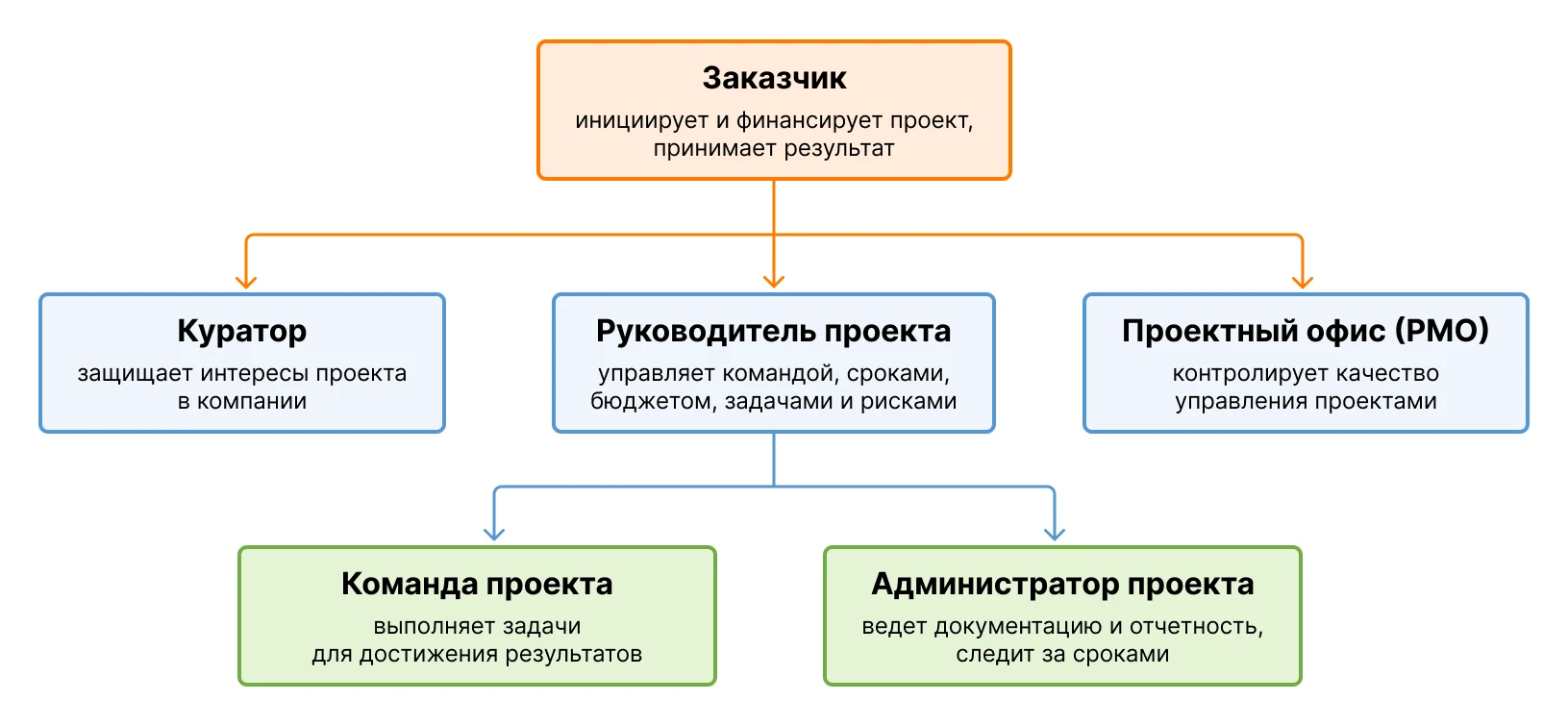 - куратор — представитель высшего руководства, обеспечивает стратегическую поддержку, принимает ключевые управленческие решения и защищает интересы проекта на уровне компании;