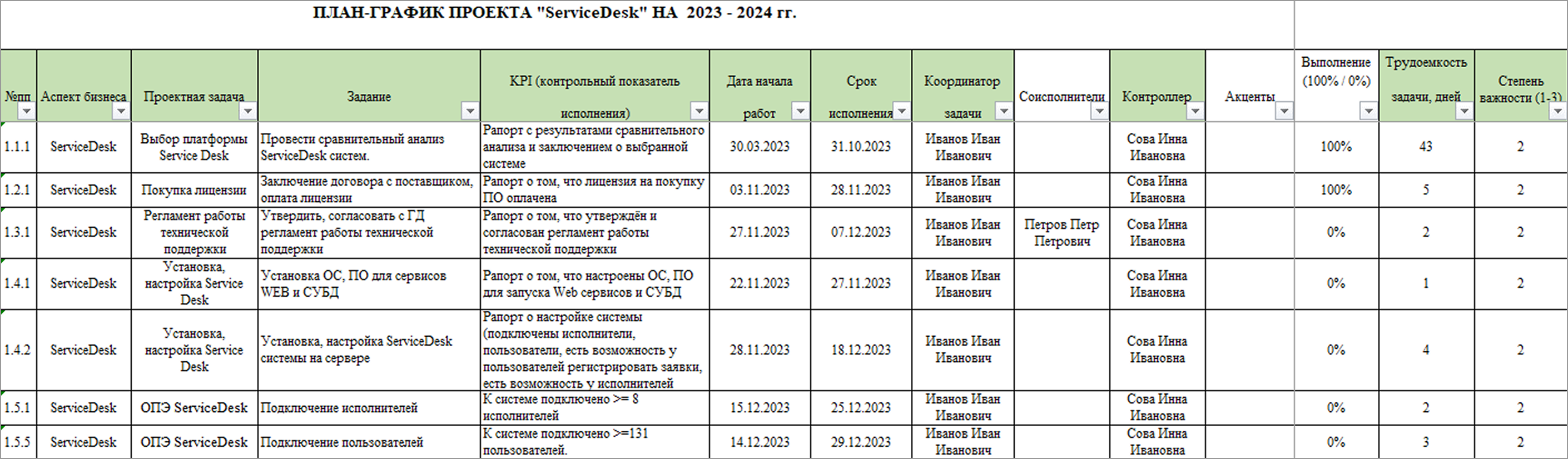 Перед запуском проекта заполняется план-график в формате Excel, где фиксируются даты этапов работ, координаторы, соисполнители, контролер, трудоемкость и степень важности. Далее документ импортируется в систему Directum Projects без потери данных.