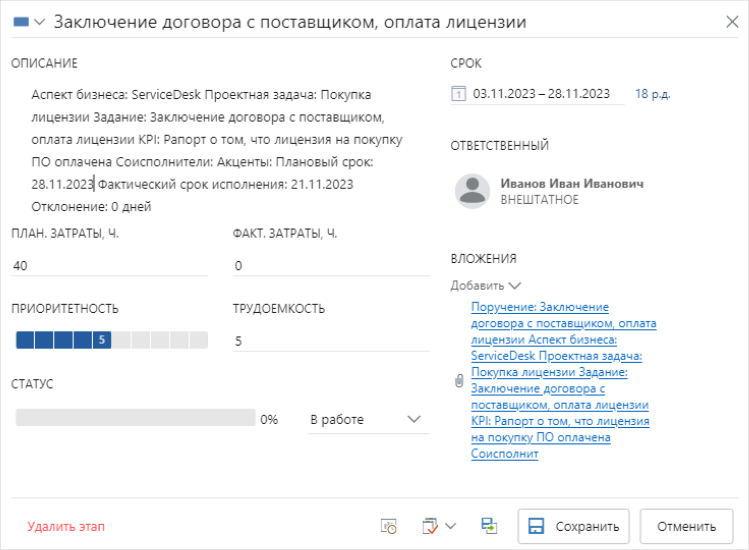 Чтобы контролер смог оценить результаты выполнения по пятибалльной шкале, стандартные задачи в «Морском Трасте» заменили на поручения. В карточке видны описание задания, ответственные, плановые сроки и трудоемкость. Во вложения добавляется сформированный документ.