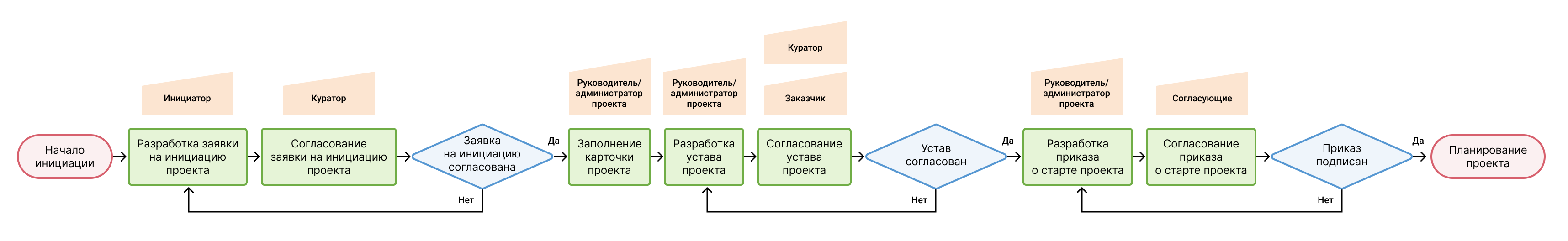 Регламенты помогают улучшить взаимодействие команды, поставить цели и идти и к ним. Ниже можно увидеть, как строится процесс инициации проекта по нотации BPMN: