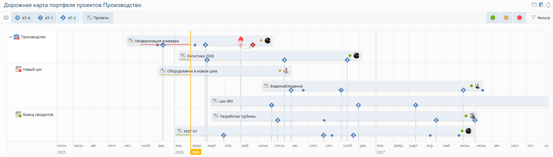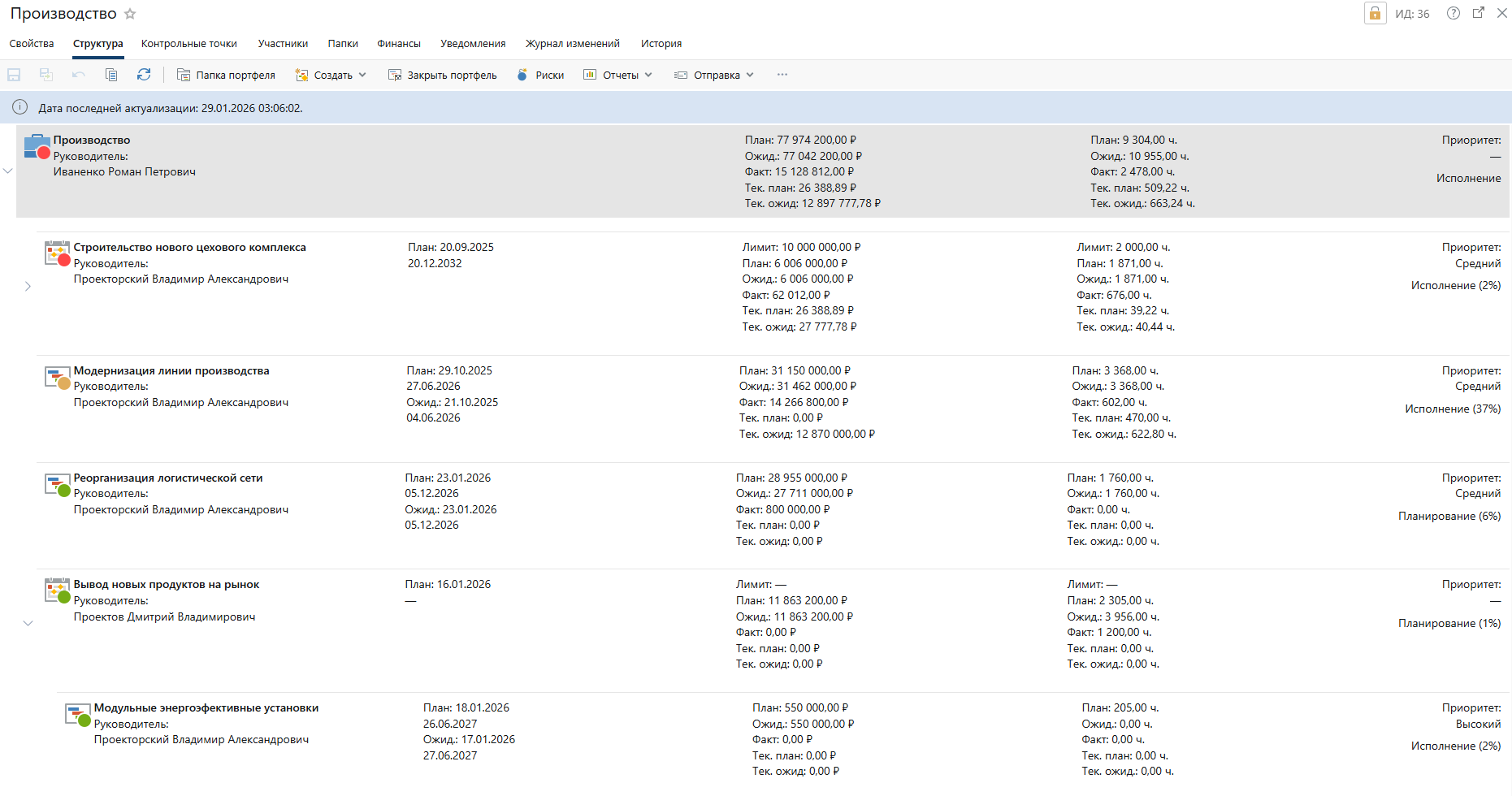- группировать проекты в портфели и программы, распределять между ними ресурсы и бюджет;