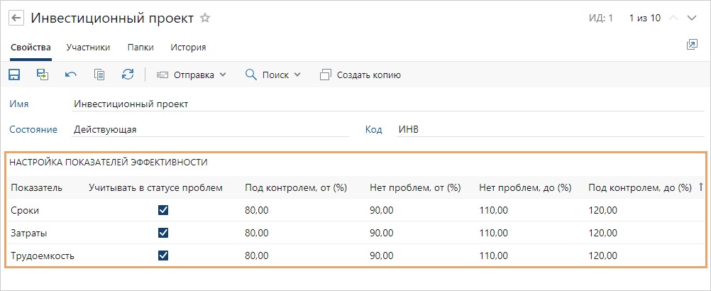 Поможет Directum Projects и при анализе здоровья проекта, программы или портфеля. Система будет сигнализировать о проблемах, если сроки, затраты и трудоемкость существенно отклонились от плановых значений. Диапазоны задаются для разных видов проектов при настройке показателей эффективности.