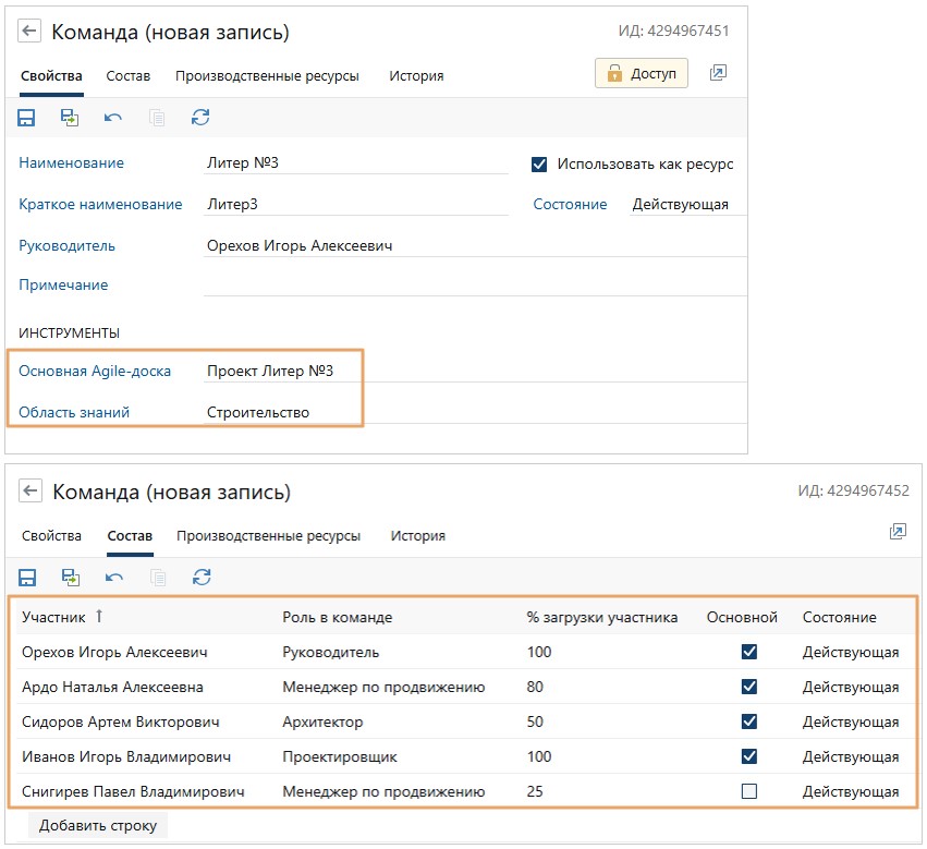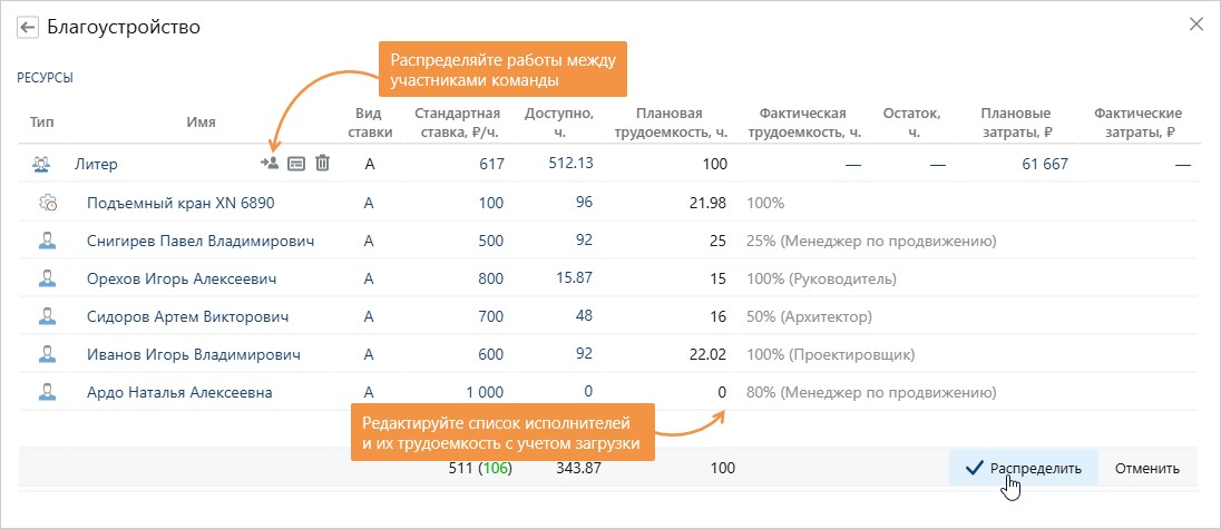 • выбрать основных и дополнительных участников, включить производственные ресурсы и указать процент участия каждого сотрудника;