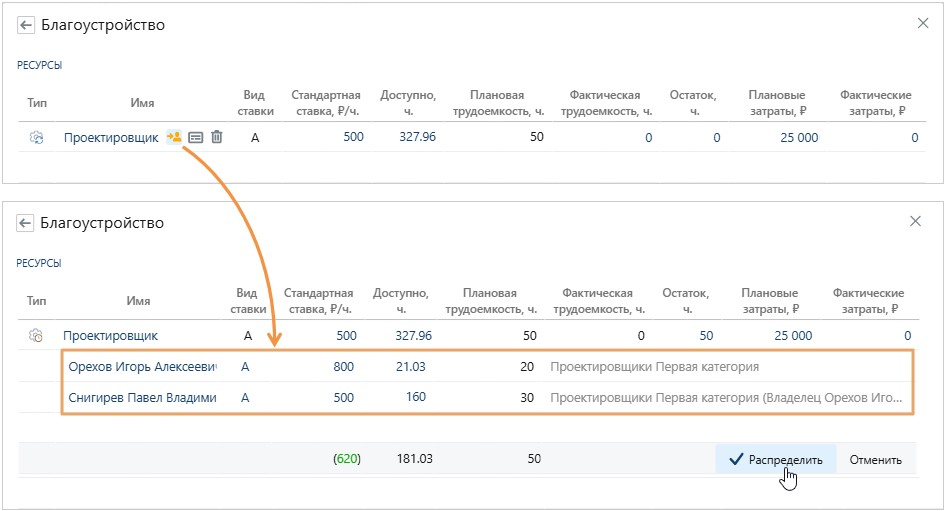 Распределение трудоемкости с типового ресурса на конкретных сотрудников