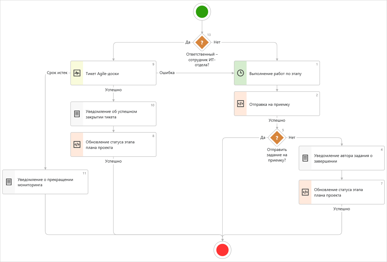 Работа с Agile-досками легко встраивается в бизнес-процессы компании с помощью no-code-настройки. Аналитики и руководители проектов могут без привлечения вендора создавать сквозные процессы между командами. Например, чтобы на доске автоматически формировался тикет для выполнения работ по этапу проекта. Когда сотрудник завершит тикет, в плане по умолчанию обновится статус этапа.