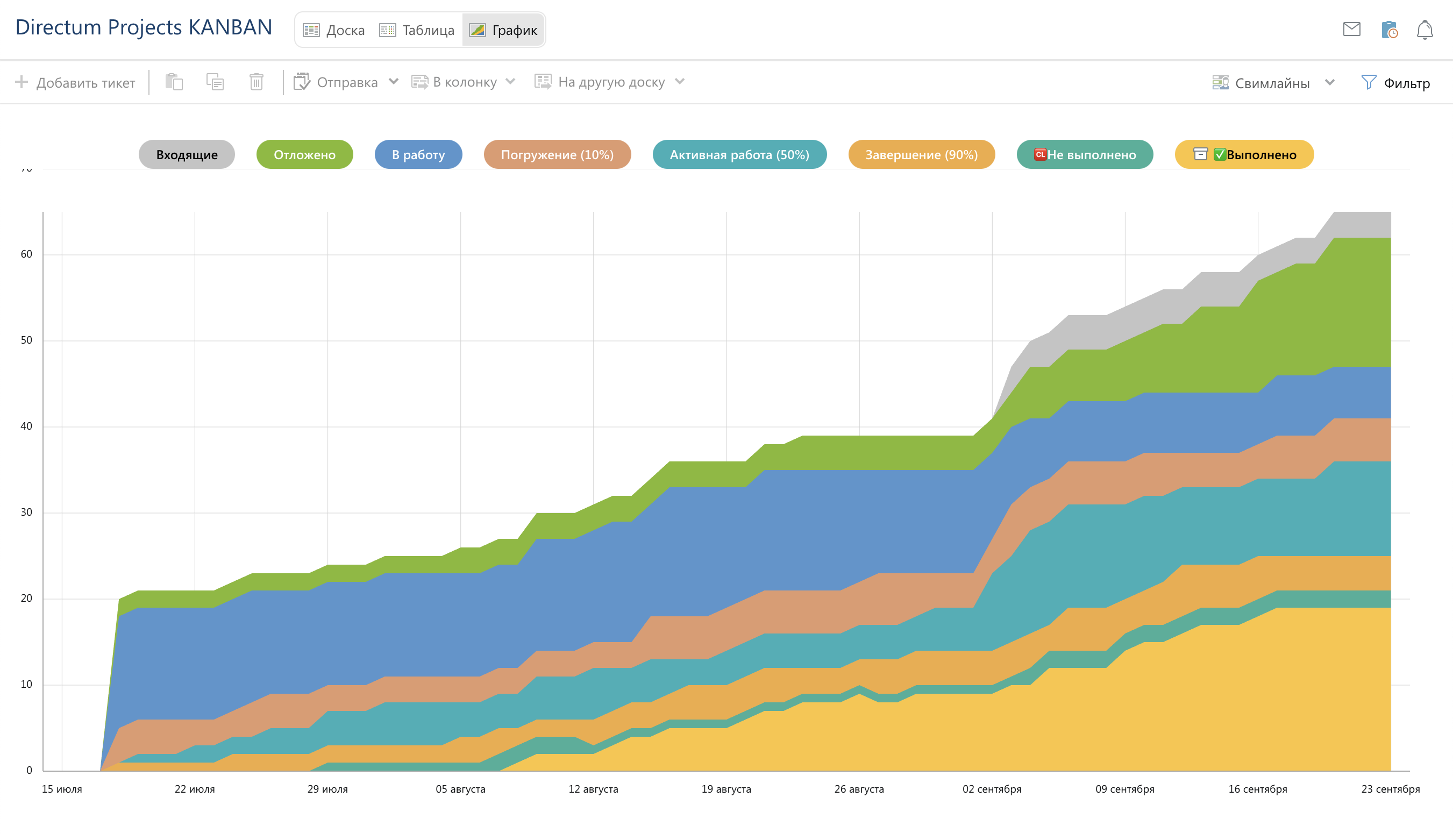 C помощью накопительной диаграммы потока можно отслеживать количество тикетов в колонках доски и динамику работы с ними. Благодаря ей руководитель может оценить, насколько стабильно протекают работы от этапа к этапу, а также выявить точки улучшения. Например, если количество тикетов в одной колонке продолжает расти, а в другой — остается без изменений, это может означать, что возникли сложности на одном из этапов.
