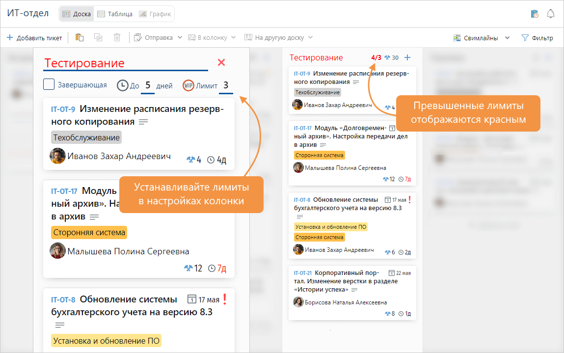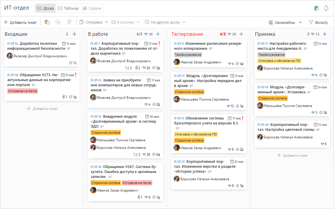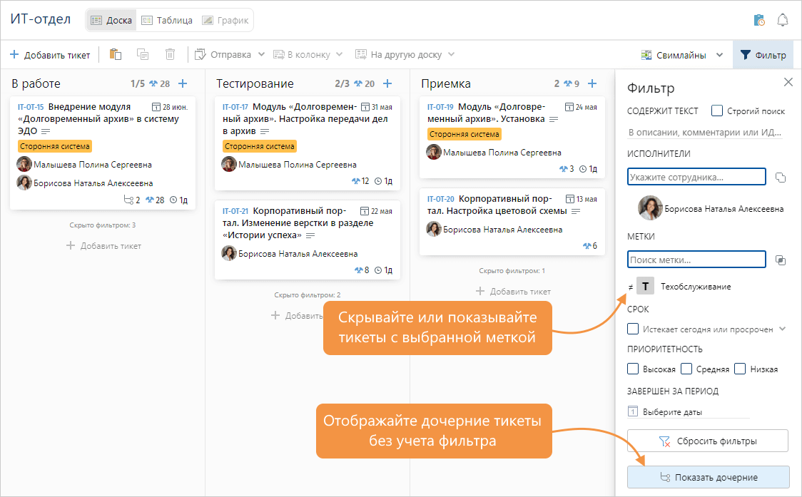 Визуализация работ на Agile-доске повышает прозрачность и управляемость работ. Доска наглядно демонстрирует загрузку исполнителей, позволяя фильтровать работы по сотрудникам, сроку и другим критериям. Благодаря этому можно своевременно перераспределять задачи и предотвращать возникновение «бутылочного горлышка», когда весь проект стопорится из-за высокой загрузки отдельных сотрудников.