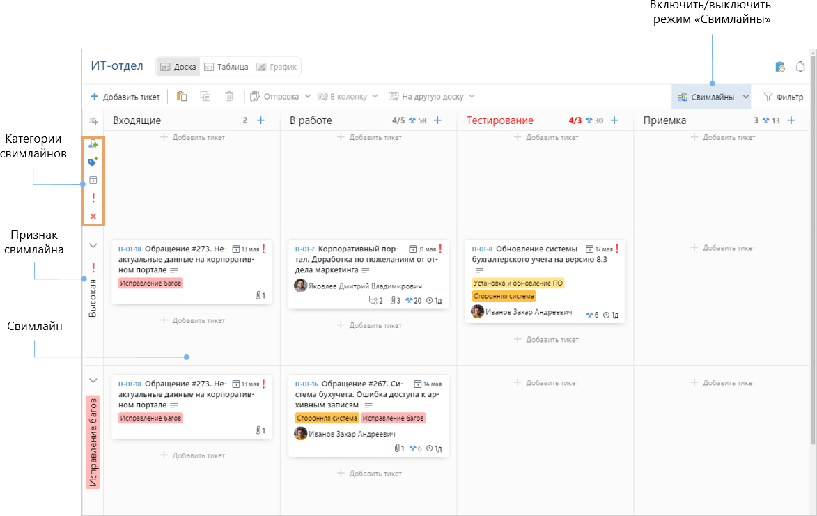 Чтобы держать фокус на приоритетных задачах и оперативно реагировать на изменения в ходе работ, руководитель и рядовые сотрудники используют горизонтальные дорожки, которые называются свимлайнами. В них отбираются тикеты по заданным критериям, например, приоритетности или метке.