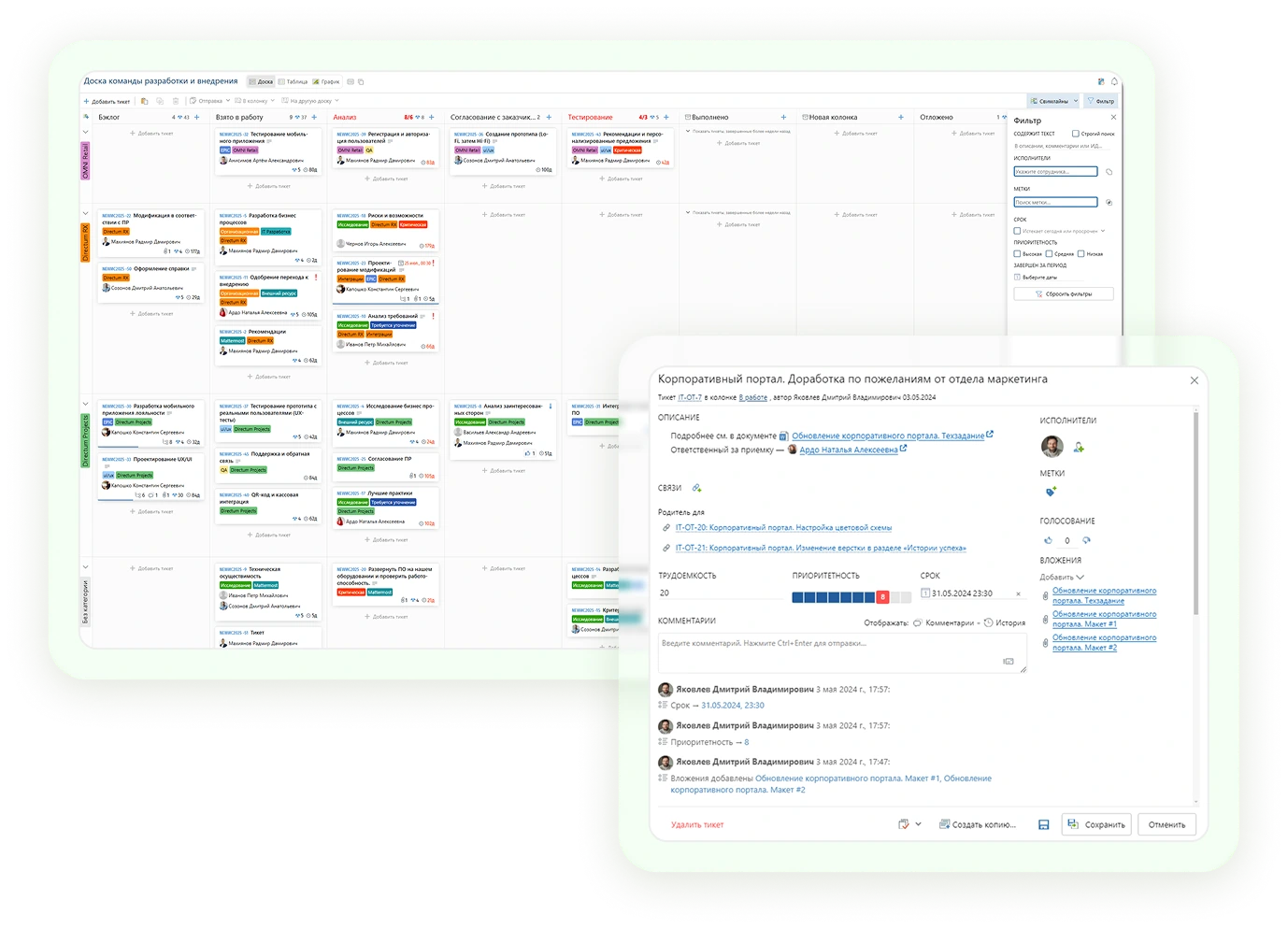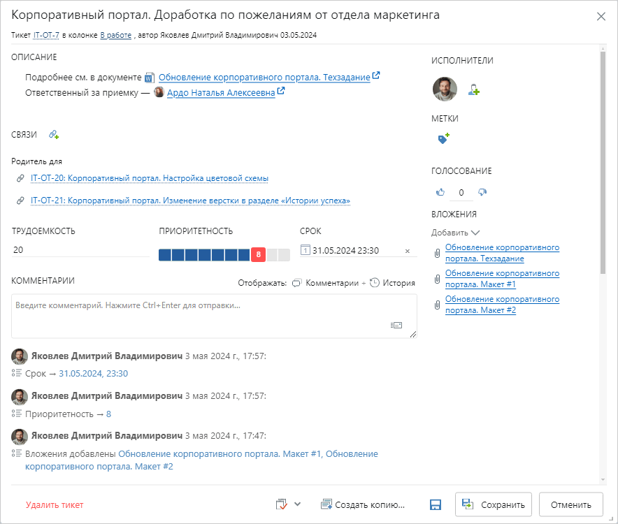 Тикет напоминает бумажный стикер, но его возможности намного шире. В него можно добавить описание работ, ссылки на документы, указать исполнителей, сроки, трудоемкость и приоритет задачи.