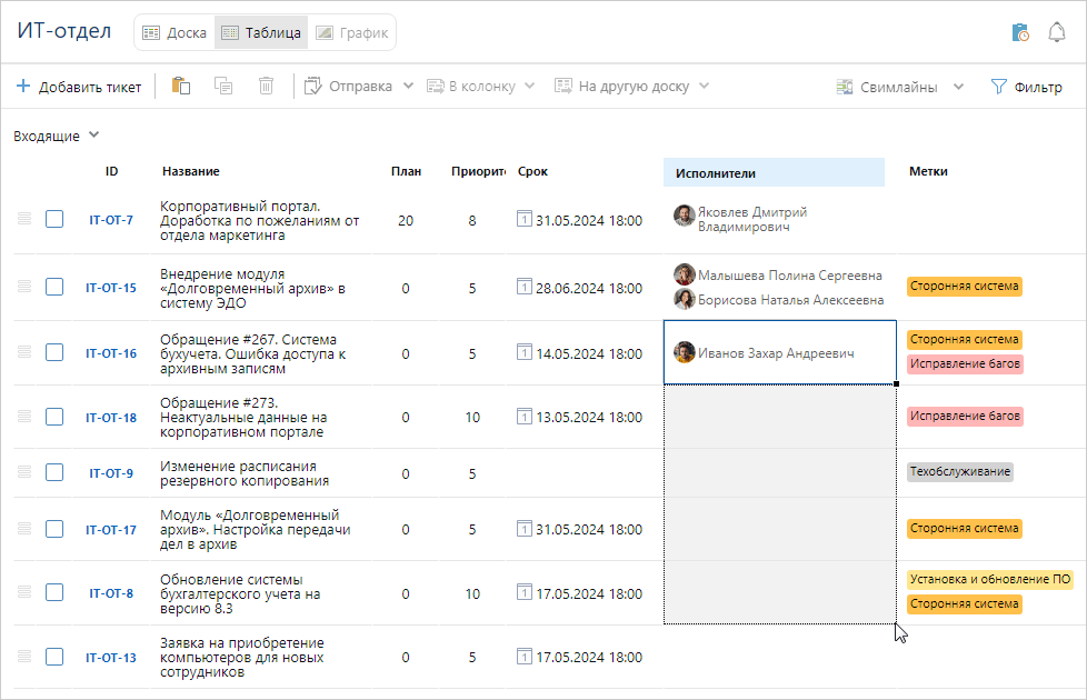 Есть несколько способов быстро заполнить Agile-доску. Например, на старте проекта руководитель может составить список планируемых работ в табличном представлении доски, где каждая строка соответствует тикету:
