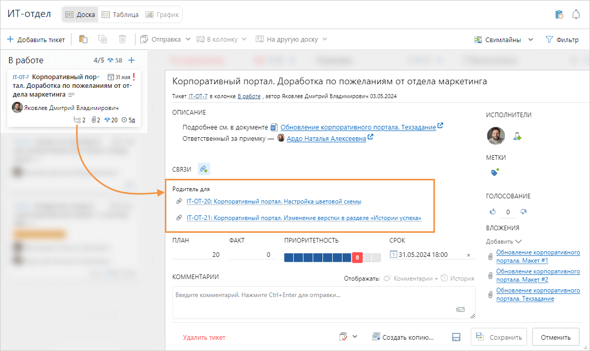Тикеты можно создавать поштучно, например при поступлении новых требований. Также можно декомпозировать масштабные работы, создав дочерние тикеты. Связь между родительским и дочерним тикетом устанавливается в пару кликов: