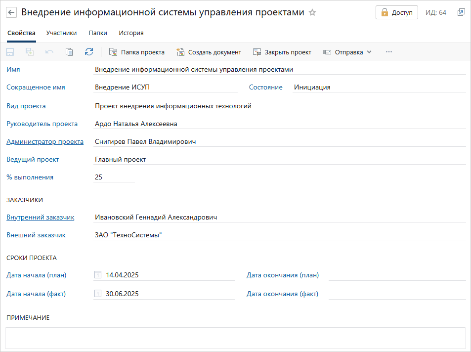 В начале работ руководитель создает карточку проекта. Он заполняет в ней основную информацию: указывает участников, сроки и настраивает структуру папок. Таким образом, сведения о проекте доступны в одном месте.