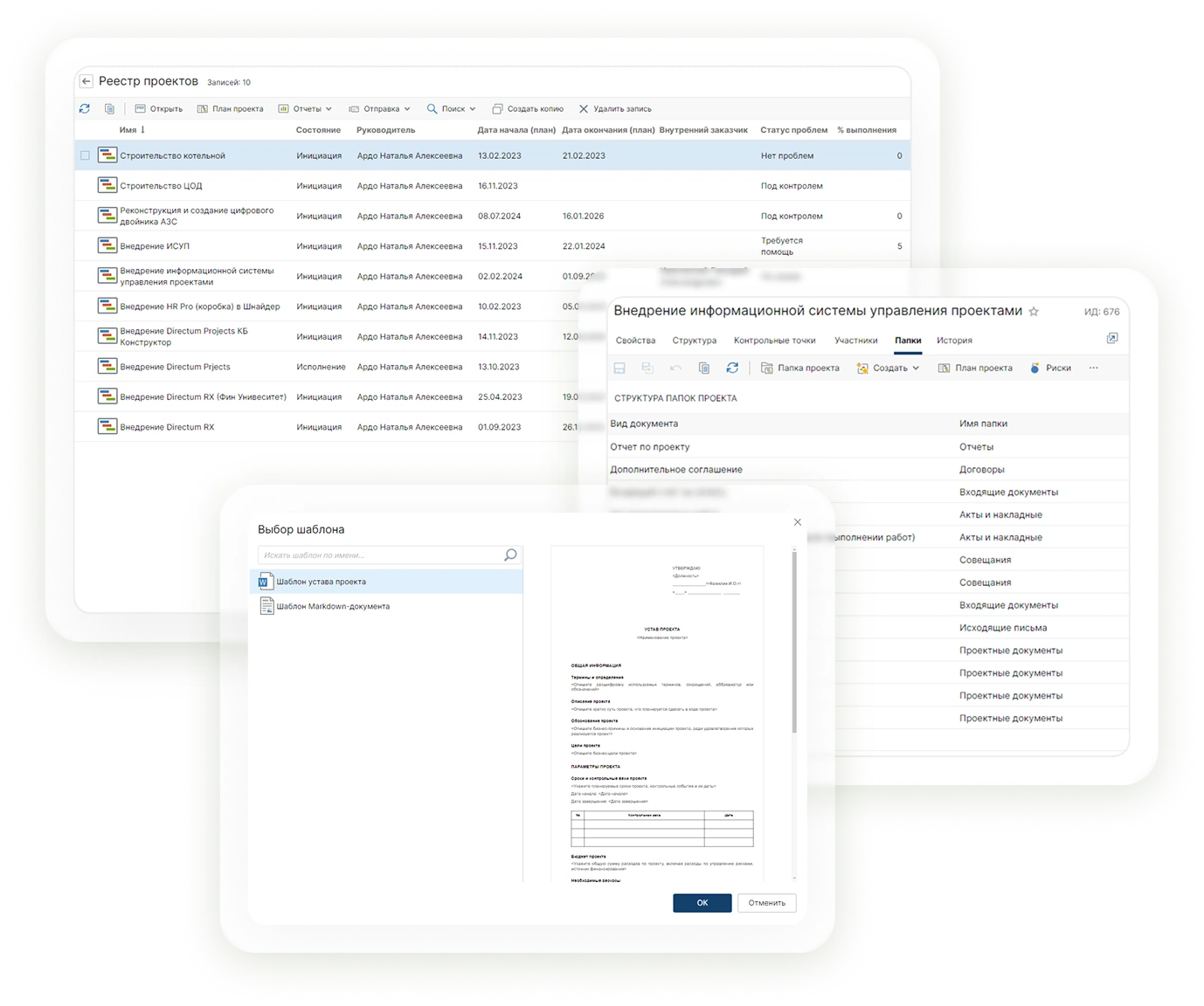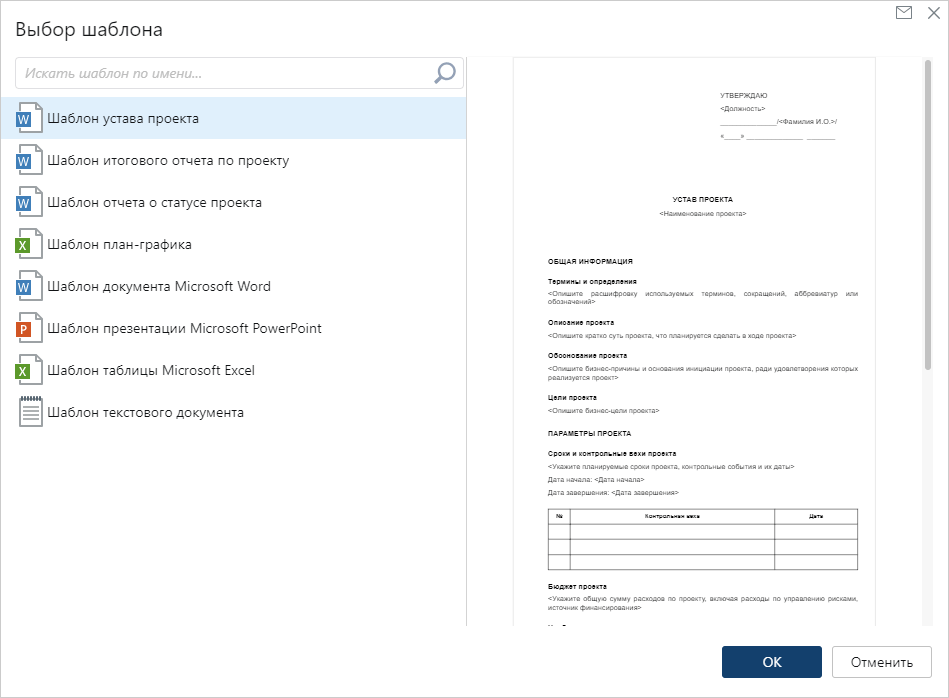Прямо из карточки проекта руководитель в один клик создает устав и предварительный план работ по проекту, в которых фиксирует цели, ресурсы, контрольные точки, порядок взаимодействия участников. Документы по проекту можно быстро создать с помощью генеративного ИИ. Для единообразного оформления документации используются готовые шаблоны с текстом.