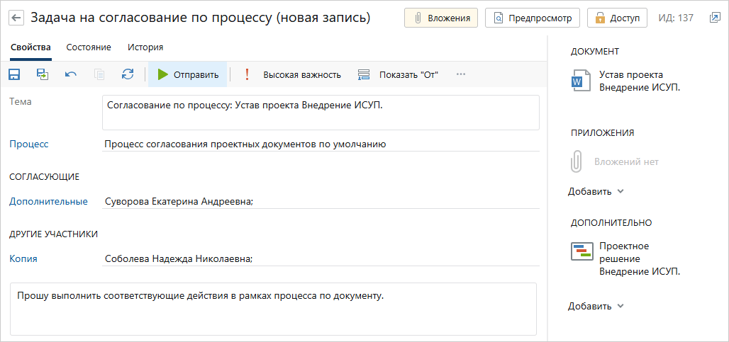 На следующем этапе руководитель проекта определяет оптимальный состав работ для достижения целей. Планы детализируются и уточняются, а затем отправляются на согласование и утверждение по принятым процессам. При этом каждая компания может легко настроить порядок согласования проектных документов под себя с помощью удобного графического редактора.