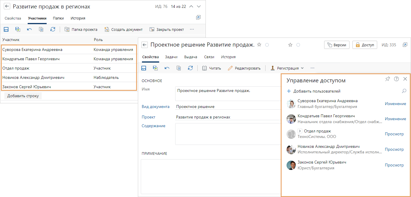 Например, если сотрудник входит в роль «Команда управления», он может редактировать документы проекта, а если входит в роль «Участник» — только просматривать их.