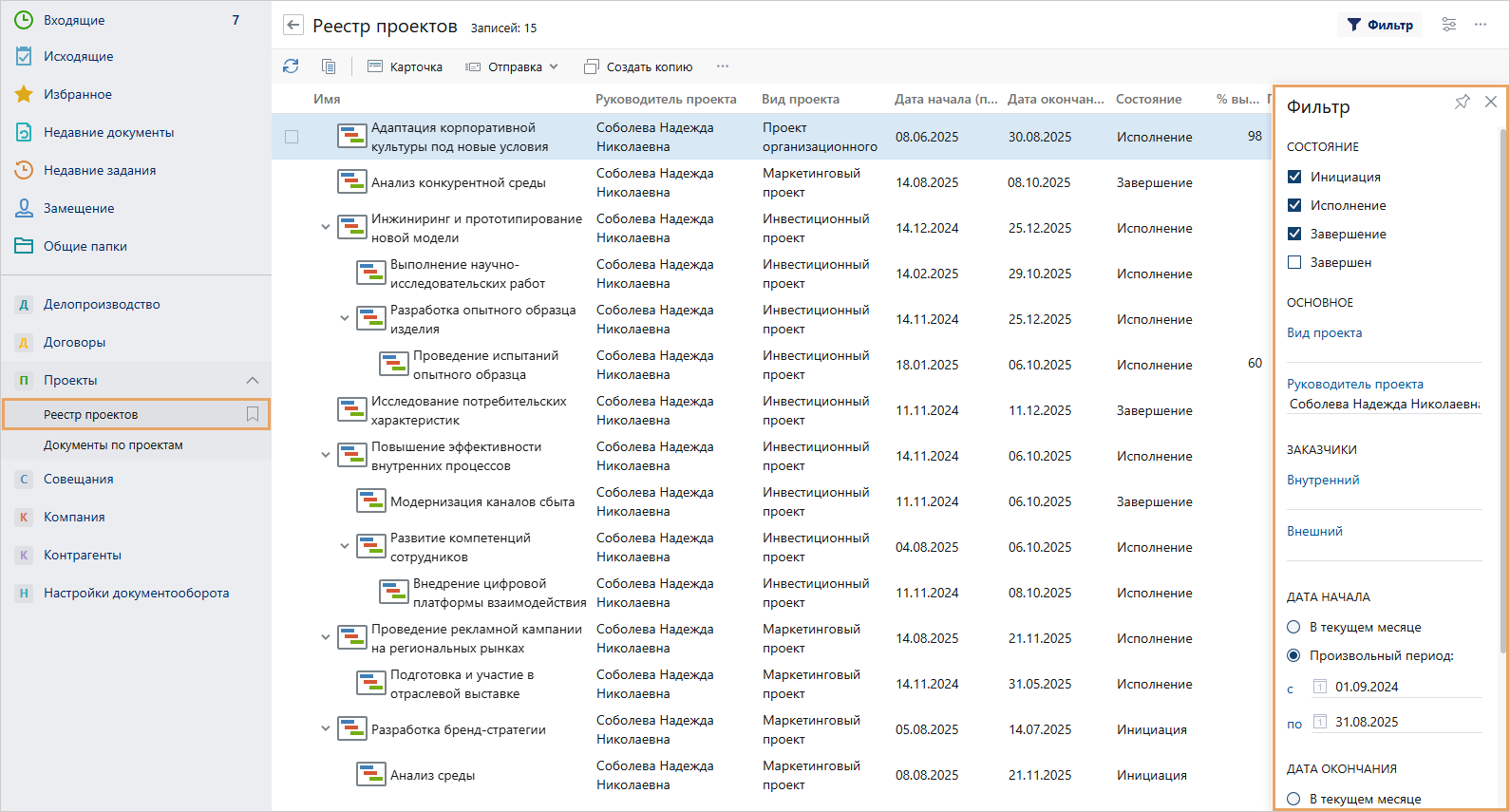 В системе руководитель проекта контролирует исполнение работ с помощью постановки задач и выдачи поручений. Также он может отслеживать и находить новые документы в списке «Документы по проектам» с помощью фильтров и сортировки.