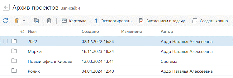 Документы проекта сохраняются в одну папку, поэтому сотрудникам не придется искать их по всей системе. К папке можно в любой момент перейти из карточки проекта.