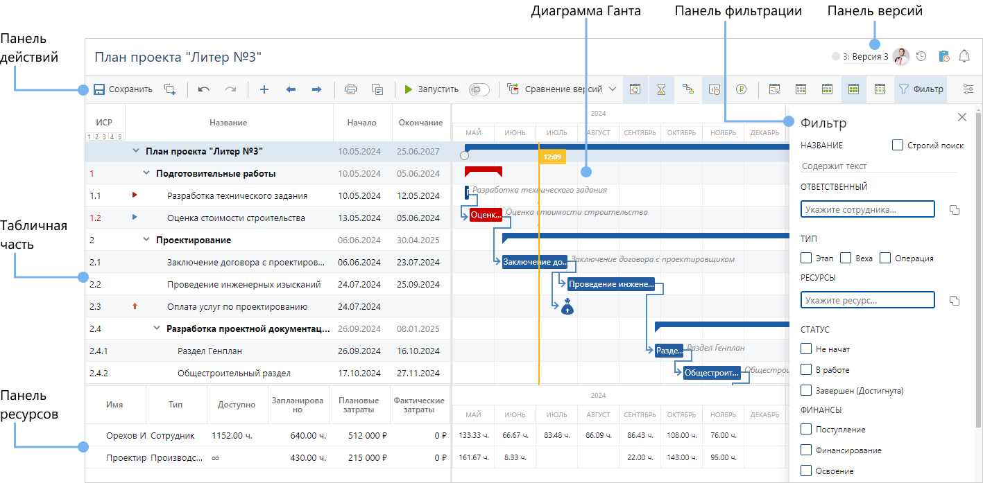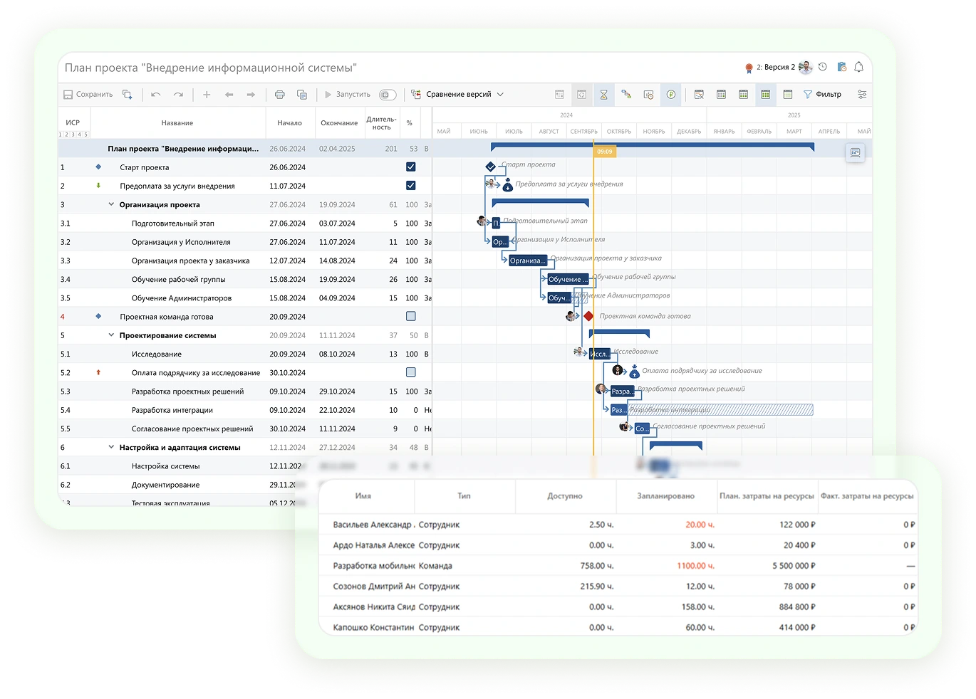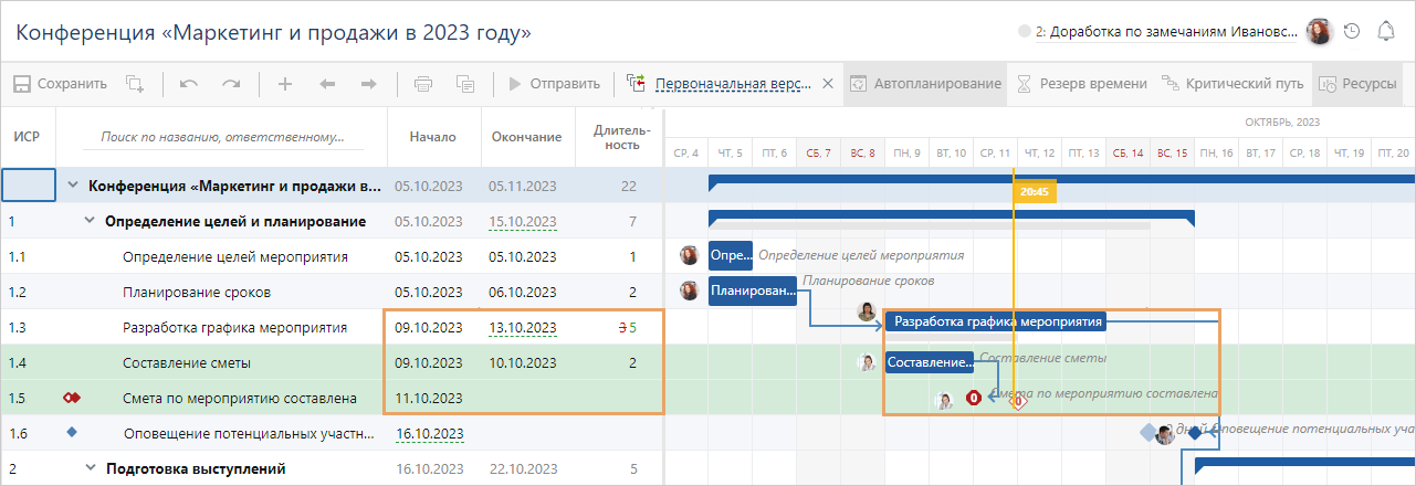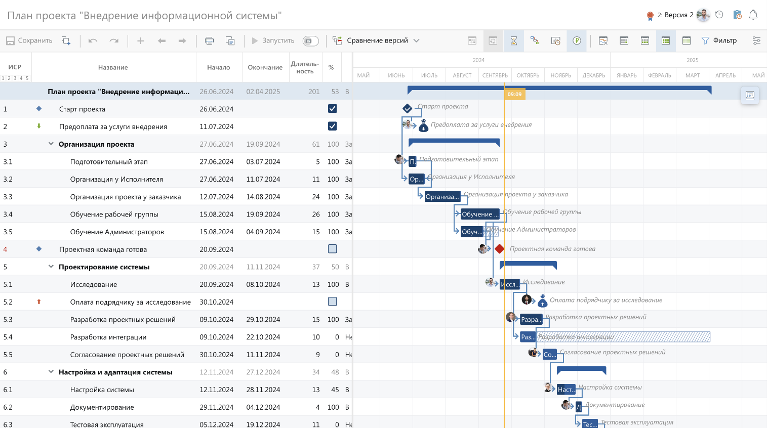 На диаграмме Ганта отображается ход работ по задачам, критический путь и резерв времени. Так можно сразу определить, требуется ли продлить этап и на какой период это можно сделать без сдвига длительности проекта. Чтобы скорректировать сроки нескольких связанных этапов сразу, используется автопланирование. Изменения можно сохранить в новую версию прямо в окне плана, а если нужно — вернуться к предыдущей версии или сравнить их между собой.