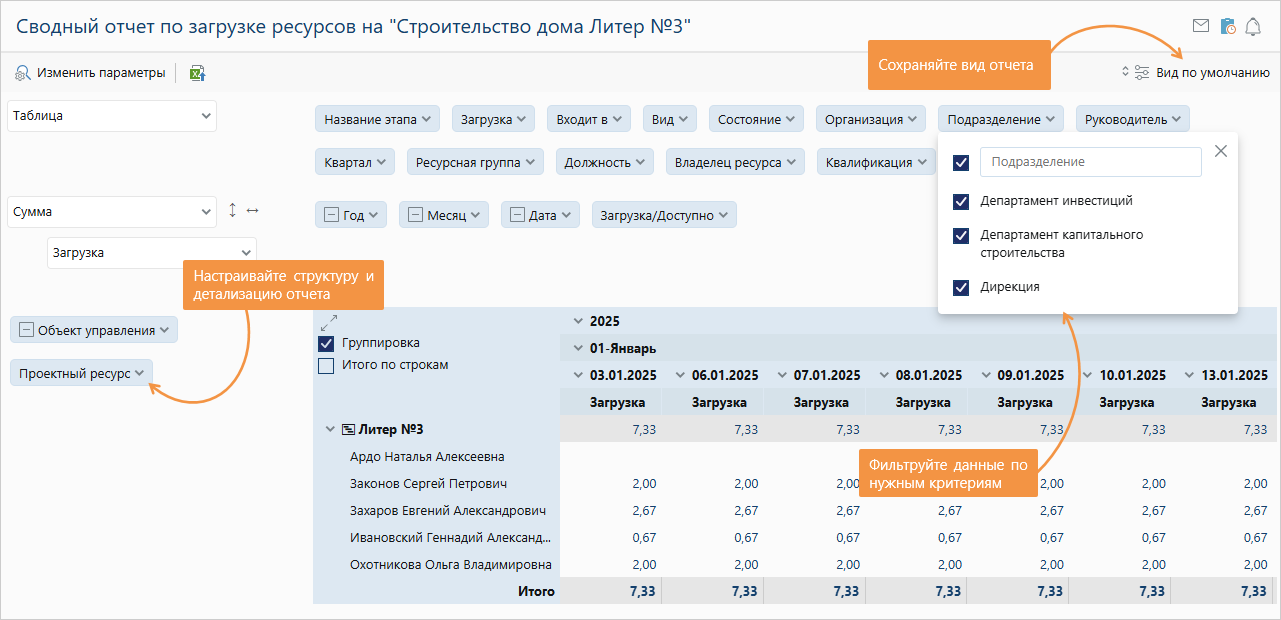 Отчет о загрузке составляется по проекту, подразделению, всей организации, а также по ресурсам с типом «Команда». Ссылкой на настроенный отчет можно поделиться с коллегами.