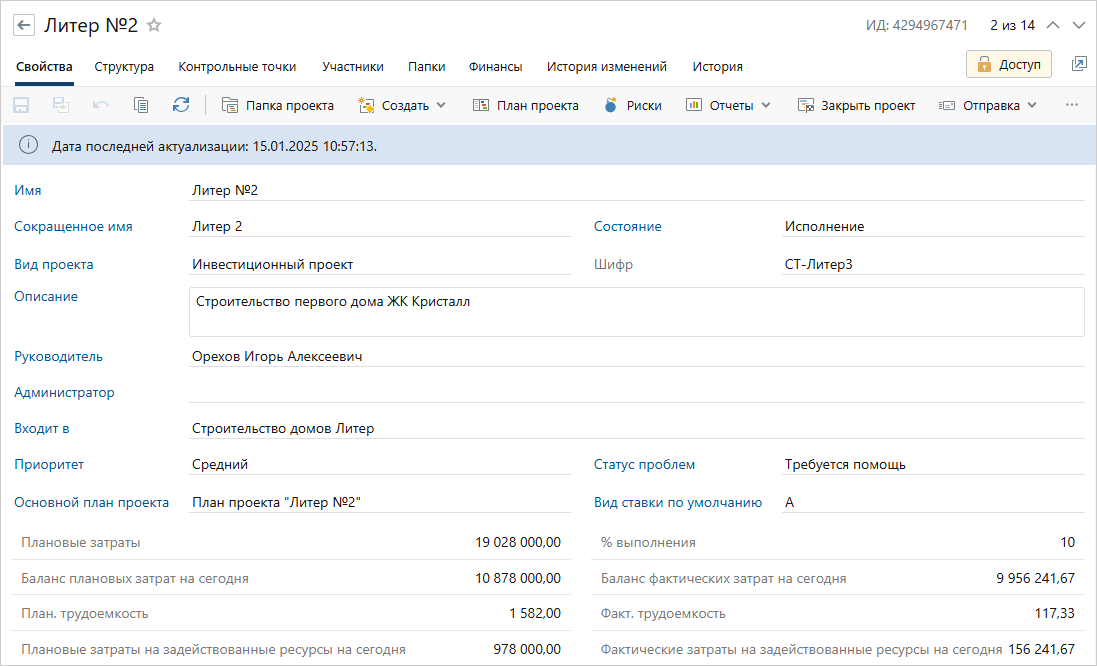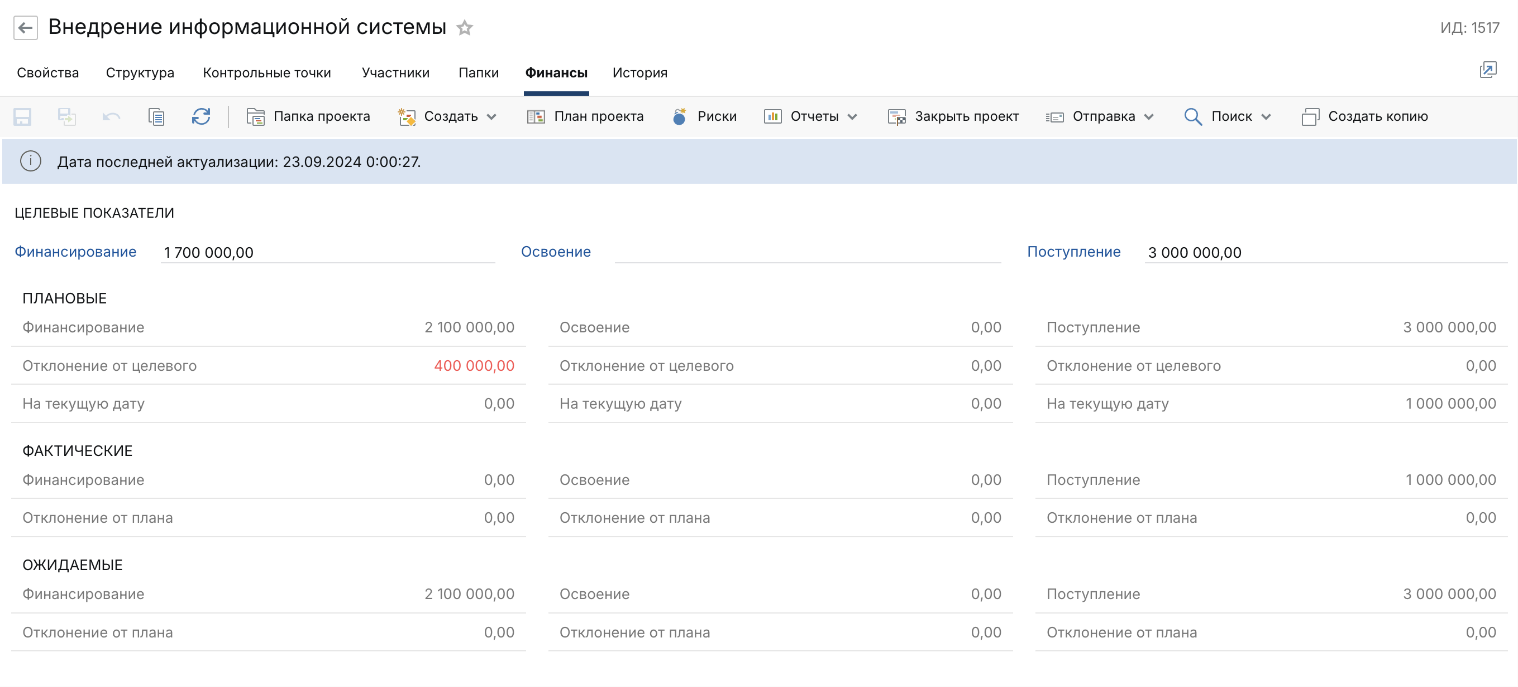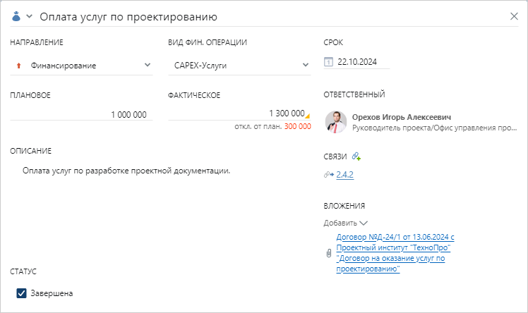 Полная информация о затратах проекта с учетом его финансовых операций отображается в карточке проекта и его плана.