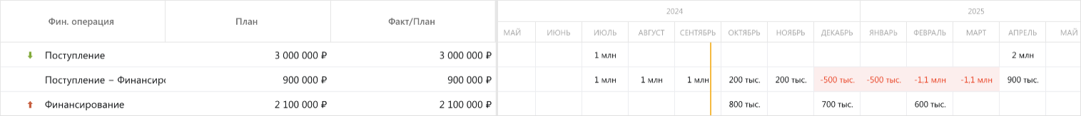 Денежный поток проекта, кассовые разрывы и задержку освоения инвестиций удобно отслеживать с помощью панели финансов. Информация об отклонениях от целевых показателей отображается также в карточке проекта