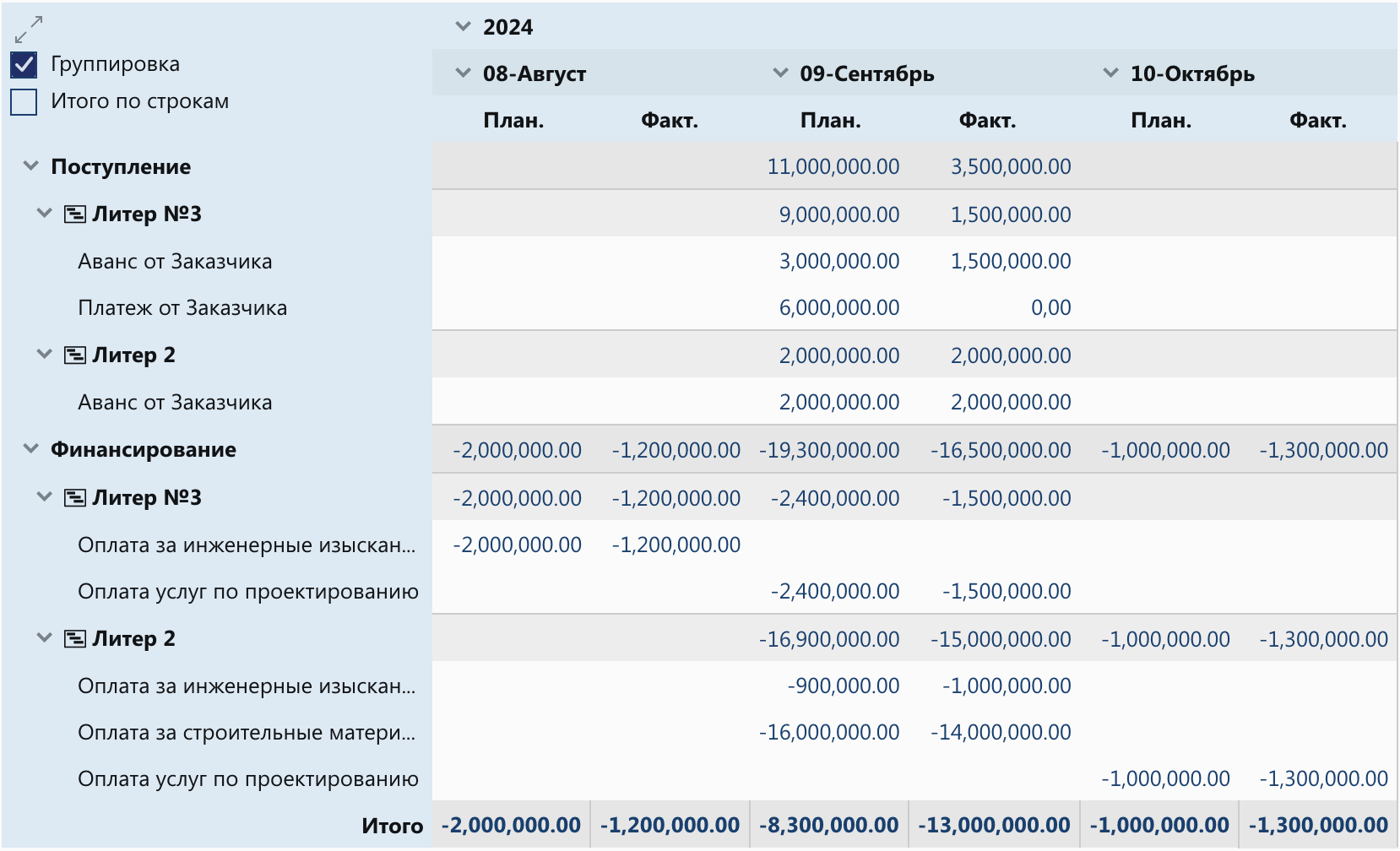 Чтобы получить полную картину финансового состояния всего портфеля проектов, руководитель формирует сводный отчет. В нем можно фильтровать, группировать и сортировать данные, чтобы посмотреть информацию, например по определенному виду операции.