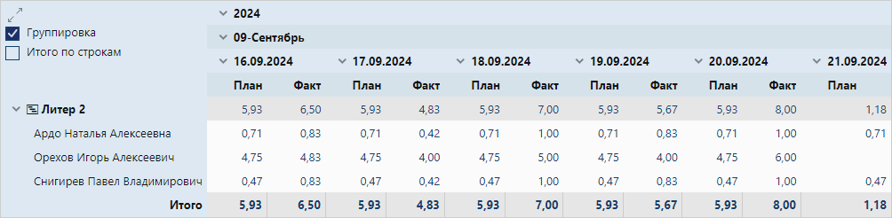 Разницу между плановыми и фактическими трудозатратами можно посмотреть в отчете по выполненным работам. Также в нем отображается норма рабочего времени ресурсов.