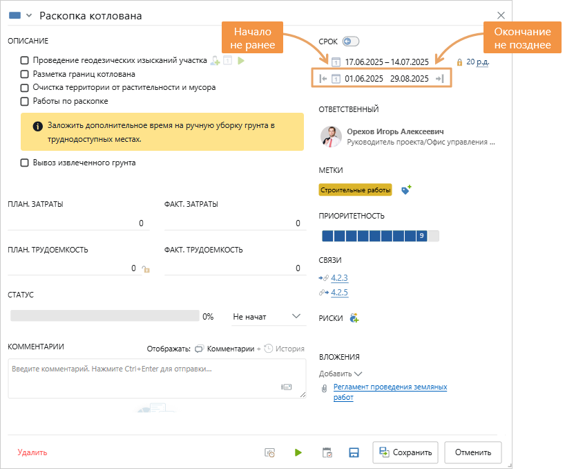 Для этапа проекта можно указать временные рамки: начало не ранее и окончание не позднее указанной даты. Это удобно, когда работы необходимо выполнить в определенный период, — например летом.