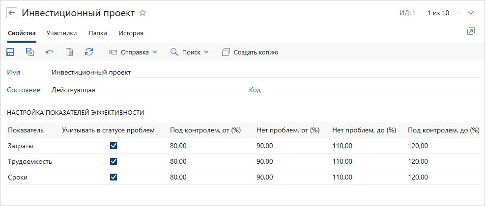 Чтобы эффективно управлять проектом, важно отслеживать его плановые и фактические сроки, трудоемкость и затраты. Решение может автоматически вычислять отклонения по этим показателям и на их основе обновлять статус проблем в карточке проекта, портфеля или программы. Настройки ключевых показателей эффективности задаются в карточке вида проекта.