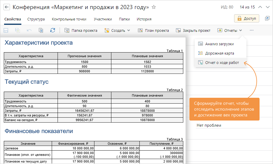 Контролировать выполнение плана помогает отчет, в котором приведена необходимая информация о проекте: его затраты, вехи, финансовые операции, а также выполненные, просроченные и предстоящие этапы.