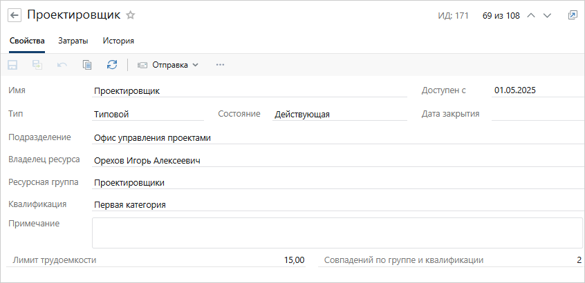 При долгосрочном планировании работ, когда конкретные исполнители еще неизвестны, руководитель может назначать на этапы типовые ресурсы. Это абстрактные ресурсы, которые включают в себя сотрудников с определенной специализацией и квалификацией или оборудование с подходящим типом и характеристиками.