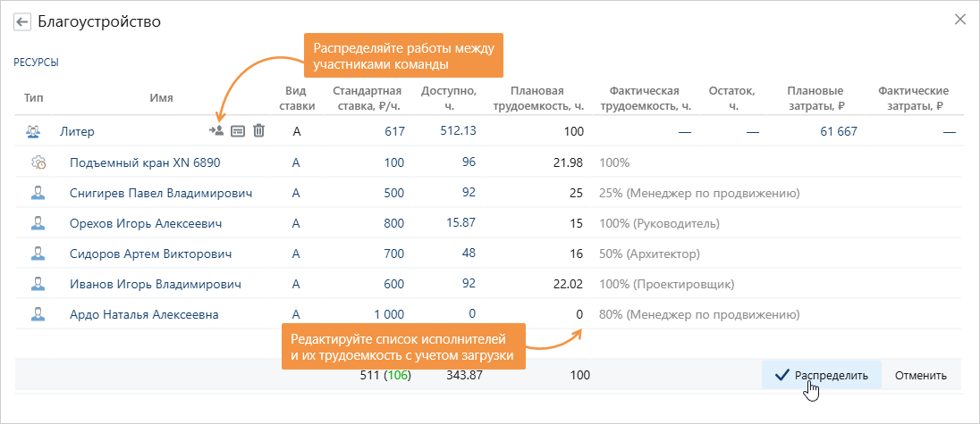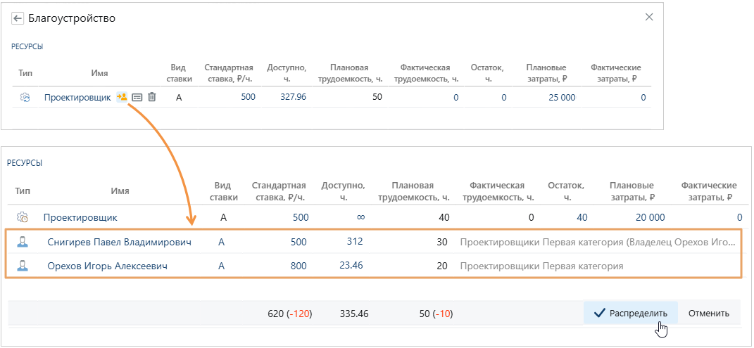 Распределить трудоемкость, рассчитанную на типовой ресурс, можно во время детализации плана: необходимо выбрать конкретных сотрудников или единицы техники.