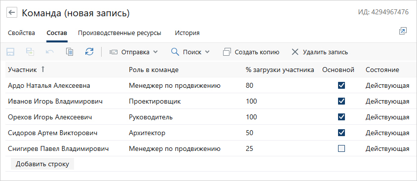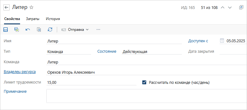 Распределить работы по проекту можно и между командами. Для этого руководителю необходимо назначить на этап соответствующий ресурс. Его доступная трудоемкость также рассчитывается автоматически по проценту загрузки участников и производственных ресурсов в карточке команды.